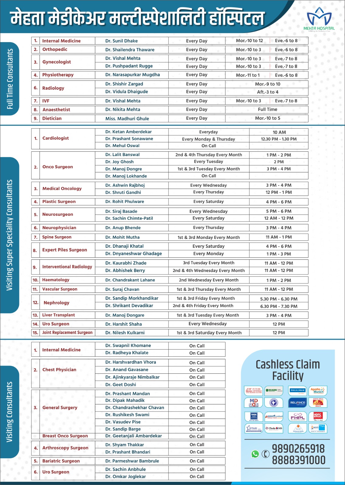 At Mehta Medicare Multispeciality Hospital, your health is in expert hands. Our team of certified and highly experienced doctors ensures accurate diagnosis, advanced treatment, and compassionate care. Backed by national and international medical credentials, our specialists combine clinical excellence with cutting-edge technology to deliver the best outcomes for every patient.